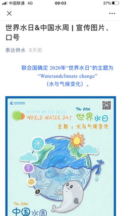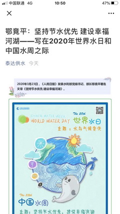 一、利用網(wǎng)絡(luò)平臺(tái)、公司對(duì)外營(yíng)業(yè)場(chǎng)所,加大宣傳力度:轉(zhuǎn)發(fā)鄂竟平部長(zhǎng)署名文章、發(fā)布2020年“世界水日”“中國(guó)水周”宣傳口號(hào)及主題宣傳畫(huà)。