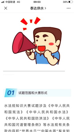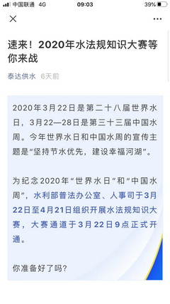 二、積極參加網(wǎng)上水法律法規(guī)知識(shí)問(wèn)答活動(dòng):利用泰達(dá)微信公眾平臺(tái)轉(zhuǎn)發(fā)由水利部普法辦公室人事司主辦的“2020年水法規(guī)知識(shí)大賽”活動(dòng),旨在達(dá)到深入宣傳水法規(guī)和深入推進(jìn)學(xué)法用法的目的。