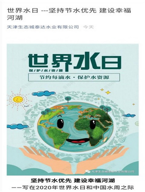 2020年是第二十八屆“世界水日”,3月22-28日是第三十三屆“中國水周”。我們在落實好當(dāng)前疫情防控工作的同時,為更好地開展和宣傳本次活動,結(jié)合生態(tài)城的實際情況,不僅發(fā)揮網(wǎng)絡(luò)優(yōu)勢推出線上宣傳活動,并用實際行動查漏節(jié)水,將“節(jié)水優(yōu)先、空間均衡、系統(tǒng)治理、兩手發(fā)力”的治水思路落實到實處。