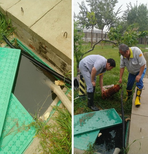 13點(diǎn)天津市氣象臺(tái)發(fā)布新一輪預(yù)警,防汛小組利用短暫的停雨間隙對(duì)廠區(qū)內(nèi)所有雨水排水井進(jìn)行清理。